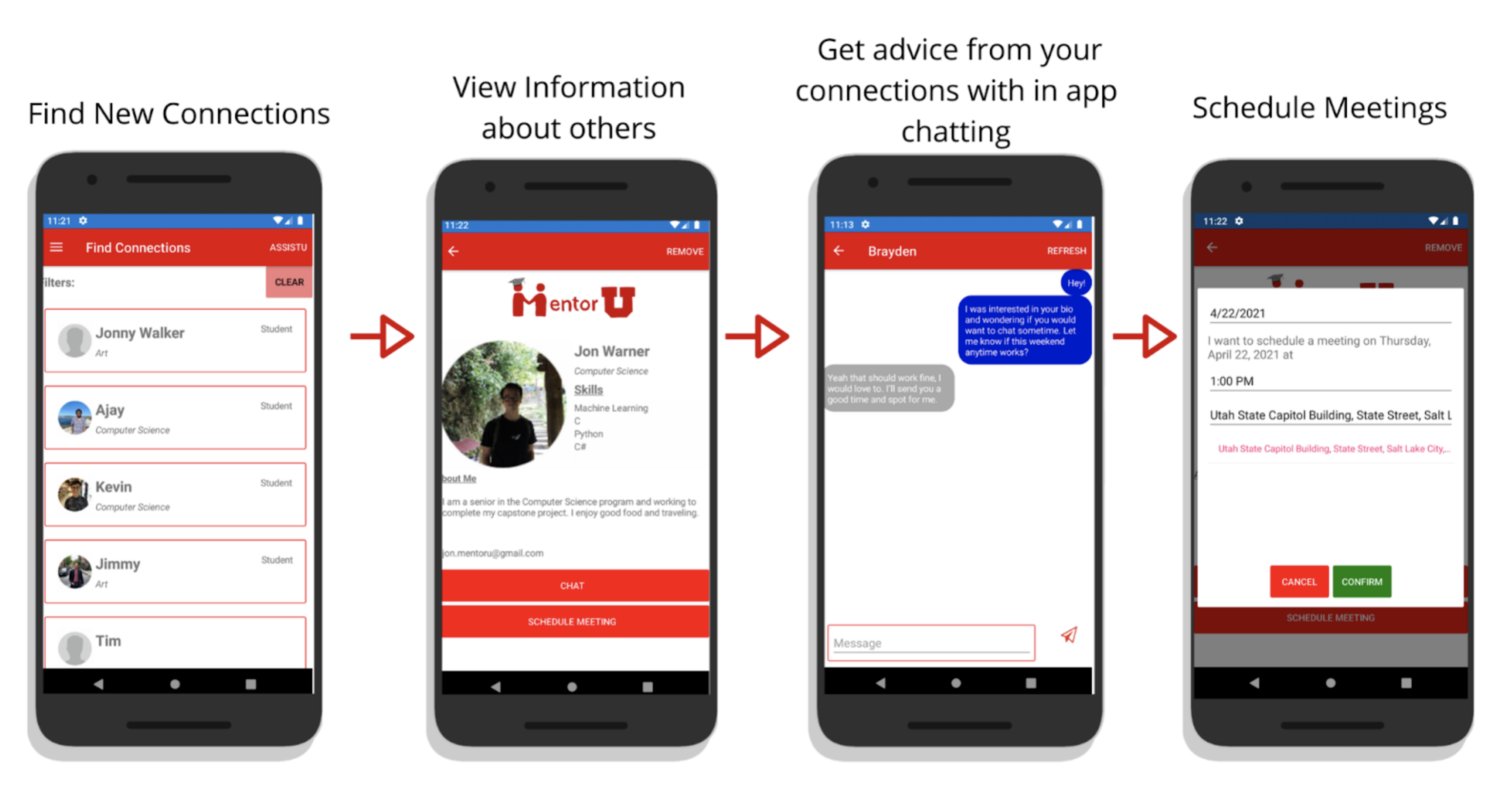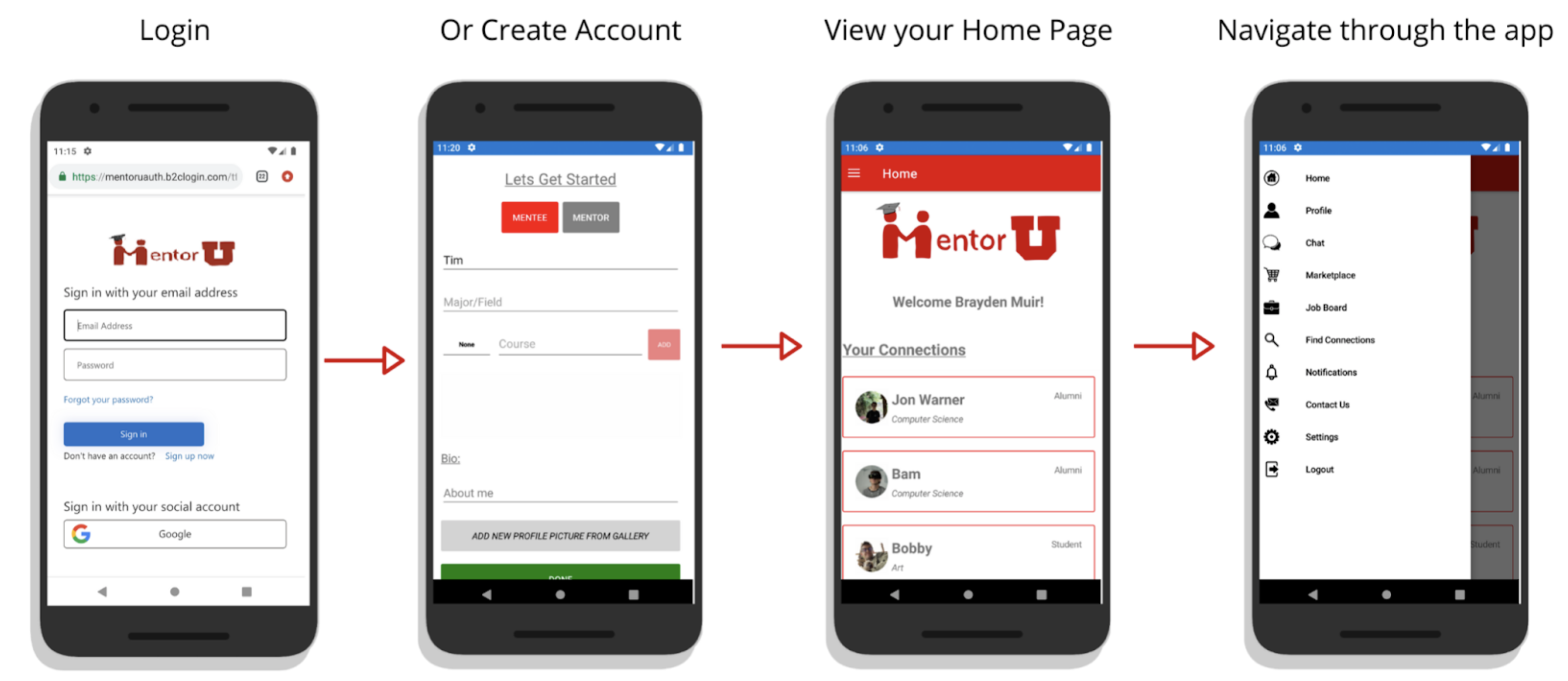 You can sign up for a MentorU account using Google account. From there, you can enter your information, and select your role as a mentor or a mentee, enter your classes/skills, bio, your name. After you complete this step, it will redirect you to the homepage, where you can start using our app.